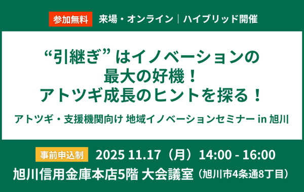 みらいコンサルティンググループ(本社:東京都中央区、代表:久保 光雄 岡⽥ 烈司)は、2025年11月17日に北海道旭川市とWEBにてハイブリッド開催されるセミナー『アトツギ・支援機関向け 地域イノベーションセミナーin 旭川 ” 引継ぎ” はイノベーションの最大の好機!アトツギ成長のヒントを探る!』に当社コンサルタントが登壇することをお知らせします。