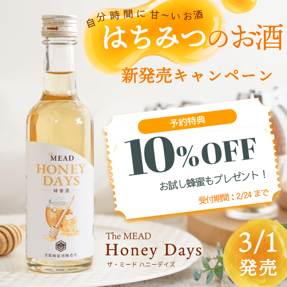 発売に先がけ、2026年2月2日(月)よりミールミィ三条本店、公式ネットショップにて予約販売を開始。予約期間中にご購入いただいた方には、発売記念の予約特典として「販売価格から10%OFF」でのご購入に加え、「本商品に使用している蜂蜜のお試しサイズ」をプレゼント。ミードの味わいを「飲んで楽しむ」だけでなく、「蜂蜜そのものを味わって知る」体験もお届けする、京都蜂蜜酒醸造所ならではの特別な予約特典です。予約受付は本日2月24日23:59まで。