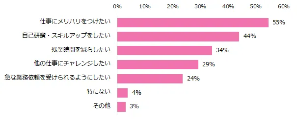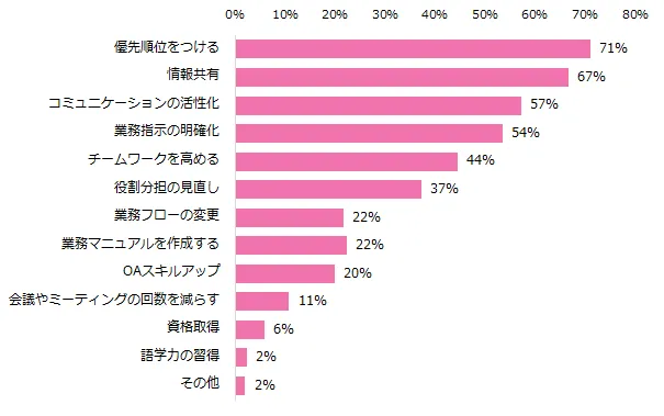 第3位は「コミュニケーションの活性化」(57%)。「1人で仕事をするわけではないので、常に周りの状況を頭に入れながら進めると、周りへの気遣いもでき、また周りからの協力を得られやすくなり、結果的に効率化が図れると思う」(30歳女性)、「困り事が出てくる事は必ずあるので、そんな時ためにも普段からコミュニケーションを心がけ、オープンに話せる環境にしておく」(47歳女性)「といった声が寄せられました。