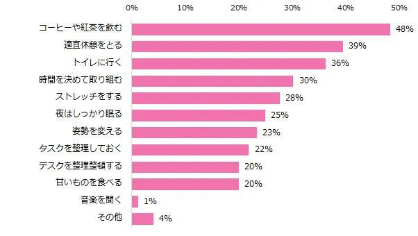 「仕事中の集中力を高めるためにやってることは何ですか?」と質問したところ、もっとも多かった回答は「コーヒーや紅茶を飲む」(48%)でした。次いで「適宜休憩をとる」(39%)、「トイレに行く」(36%)と回答が続きました。