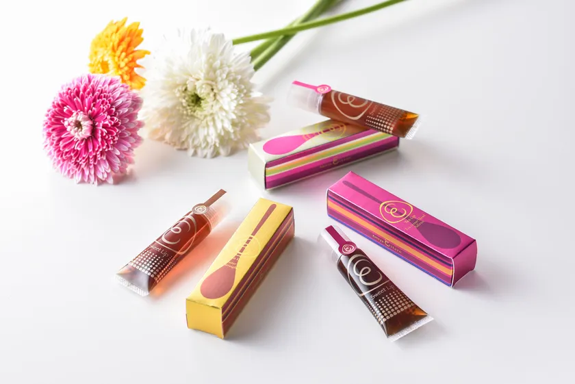 グロスリップのような仕立ての中身は、有平糖をベースにした「みつあめ」。高温で煮詰める事で生まれる香ばしい香りと、フルーツの濃縮果汁やバラの抽出液などを合せ、自然な美しいあめ色に。