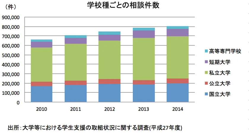 2015年度に実施され、2017年2月に公表された独立行政法人日本学生支援機構の調査によれば、対人関係や発達障害に関する悩みを中心に、大学における学生相談件数は年々増加傾向にあります。相談件数の増加・相談内容の多様化が進む一方、常勤カウンセラーの設置人数はむしろ減少しており、既存の学生相談室の相談員の負担増加が課題となっています。