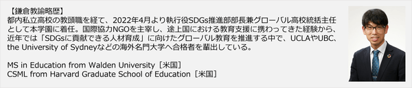 また、2023年4月より同校の新教頭として、自身も海外で学び、国際教育や海外大学進学に精通する鎌倉好男教諭が着任いたします。同氏は「Honors」クラスの立ち上げを主導し、本校の学校運営や教育活動における中心的な役割を担っていきます。