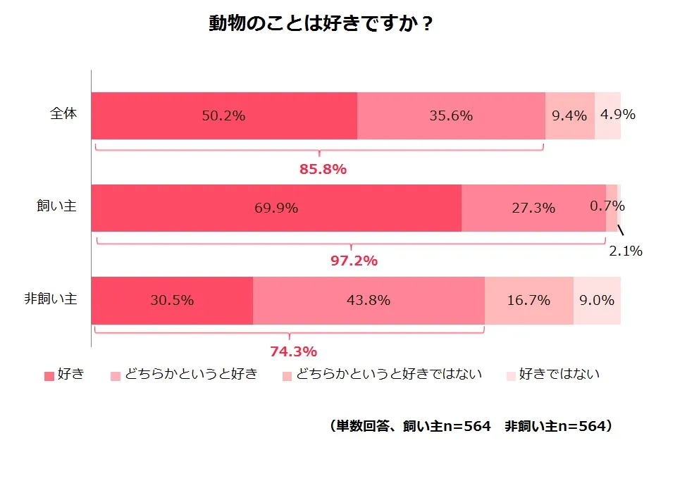 「動物は好きですか?」という質問に対し、「どちらかというと好き」を含めて全体の85.8%が「好き」という結果になりました。なお、ペットと一緒に暮らしている人の97.2%が、「動物が好き」と回答した一方、ペットと暮らしていない人は74.3%に留まったことから、ペット飼育の有無による違いも見られました。
