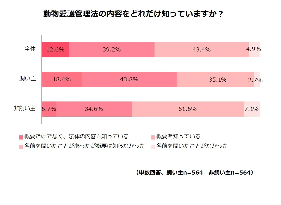 「動愛法の内容をどれだけ知っていますか?」という質問に対し、「概要だけでなく、法律の内容も知っている」と回答した人が12.6%、「概要を知っている」と回答した人が39.2%となり、約半数の人が動愛法の内容を知っていることが分かりました。前問と同様、ペット飼育の有無によって認知度に差が見られました。