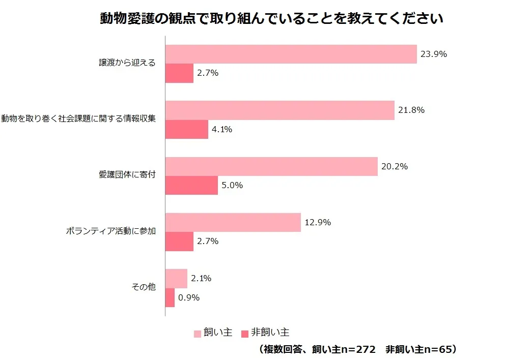 飼い主に特徴的な取り組みとしては、「譲渡の子を迎える」が最多となりました。