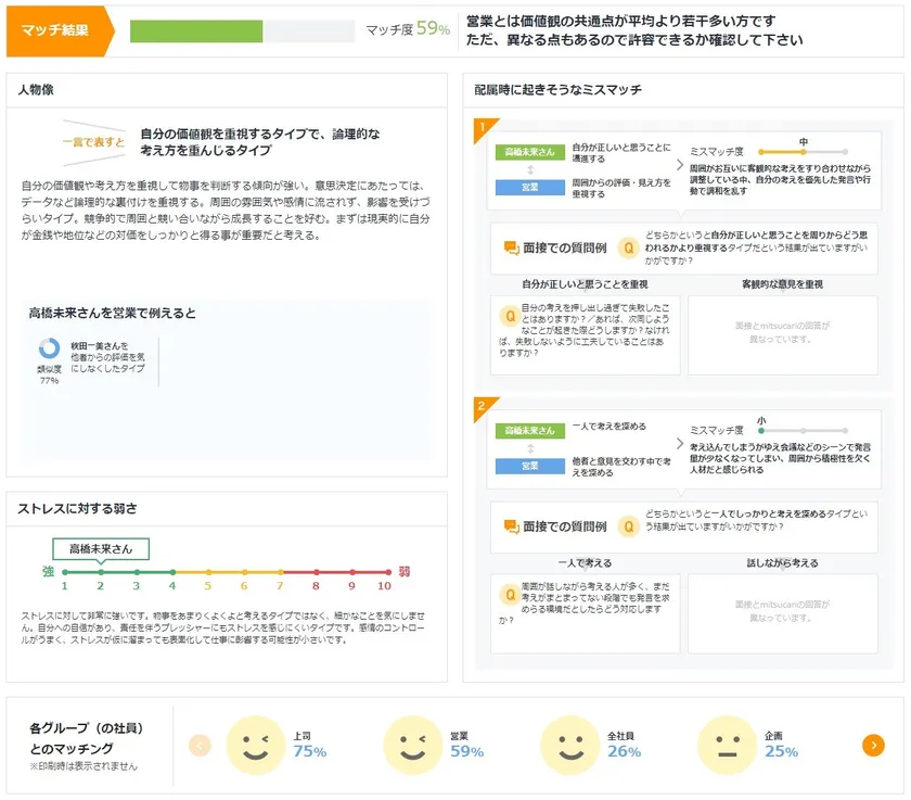 面接用シートでは、会社や部署とのマッチ度を1~100%で表示するだけでなく、応募者を理解するための人物像やストレス耐性の強さ、配属時に起きそうなミスマッチの内容と面接での関連する質問・回答例などの結果をAIが自動で提案し、面接の前に確認できます。印刷機能もあり、面接の場でもご活用いただけます。