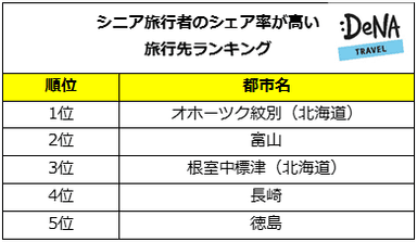 「敬老の日」直前、シニアが占める割合が高い国内旅行先ランキングを DeNAトラベルが調査