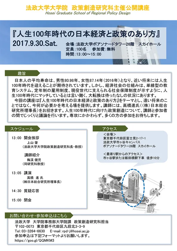 法政大学大学院政策創造研究科では、9月30日(土)に法政大学市ケ谷キャンパス(東京都千代田区)で公開講座「人生100年時代の日本経済と政策のあり方」を開催します(参加費無料、要事前申込)。