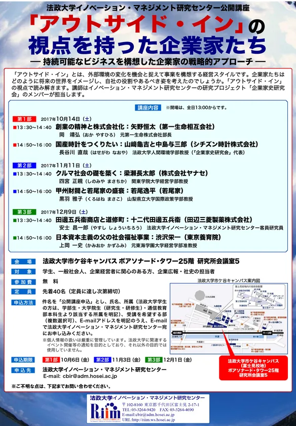 講師は、法政大学イノベーション・マネジメント研究センターの研究プロジェクト「企業家史研究会」のメンバーが担当します。
