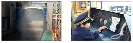 電車に乗ったままで、洗車機の中を通り抜けます。