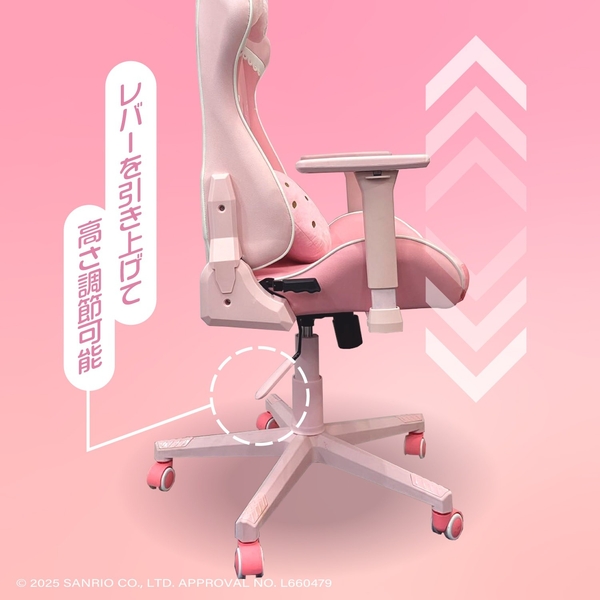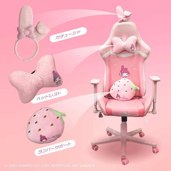 サンリオキャラクターズ「マイメロディ」をイメージしたゲーミングチェアです。カラーリングから刺繍まで、すべてマイメロディ仕様となっております。