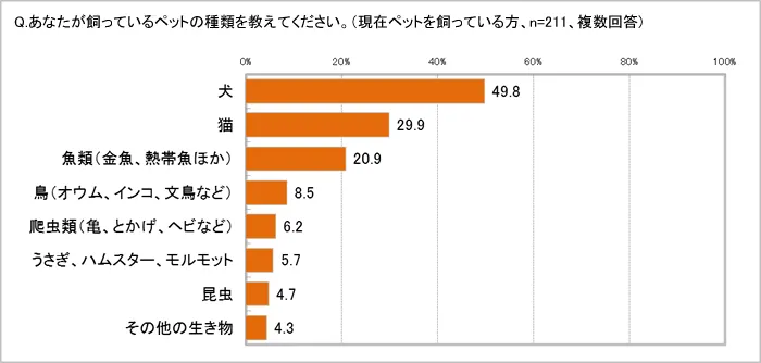 ペットを飼っている人は24.4%、飼っているのは犬49.8%、猫29.9%、魚類20.9%