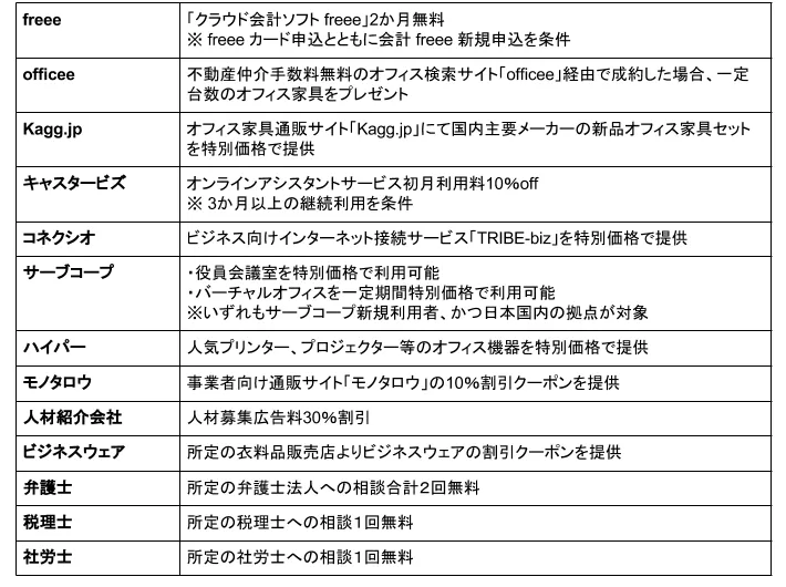 「freeeカード」をお持ちの方々に対しては、下記の連携各社(freee 以下五十音順で掲載)からスモールビジネスの経営に資する様々な特典(注2をご用意しております。「freee カード」の特典は今後もさらに拡充していく予定です。詳細は「freee カード」ウェブサイト(https://www.freee.co.jp/card)をご確認ください。
