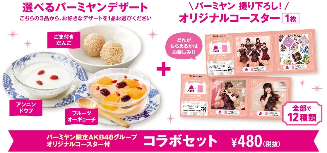 「AKB48コラボセット」をご注文いただくと、他では手に入らない、コラボレーション限定の撮り下ろし写真入りオリジナルコースターをお渡しいたします。オリジナルコースターは、ガストとバーミヤンでデザインが異なり、それぞれの店舗でAKB48・SKE48・NMB48・HKT48・NGT48各グループから2名ずつ計10種類とスペシャル写真2種類の全12種類をご用意しています。今回の機会に2つの店舗にお越しいただければと思います。