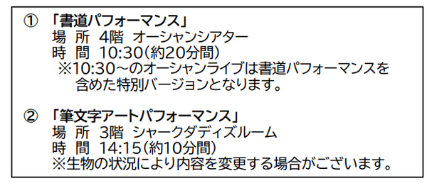 “年の移り変わり”や“世界平和”をテーマに、音楽に合わせて、個性を活かしたパフォーマンスを披露しながら作品を書き上げます。さらに、同日の午後には書道部員とひとつのアート作品を書き上げる「筆文字アートパフォーマンス」をシャークダディズルームで実施いたします。館内にカリフォルニアアシカが登場するプログラムは、当館では初の試みです。間近で繰り広げられるパフォーマンスを通して、自然と笑顔になること間違いなし。完成した筆文字アート作品はフォトスポットとして展示いたします。