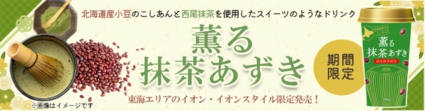 イオンリテール東海カンパニーは、3月27日(月)、「西尾の抹茶」と北海道産小豆を使用したカップ飲料「薫る抹茶あずき」を、東海エリアの「イオン」「イオンスタイル」65店舗(※1)と「おうちでイオン イオンネットスーパー」(※2)にて発売します。