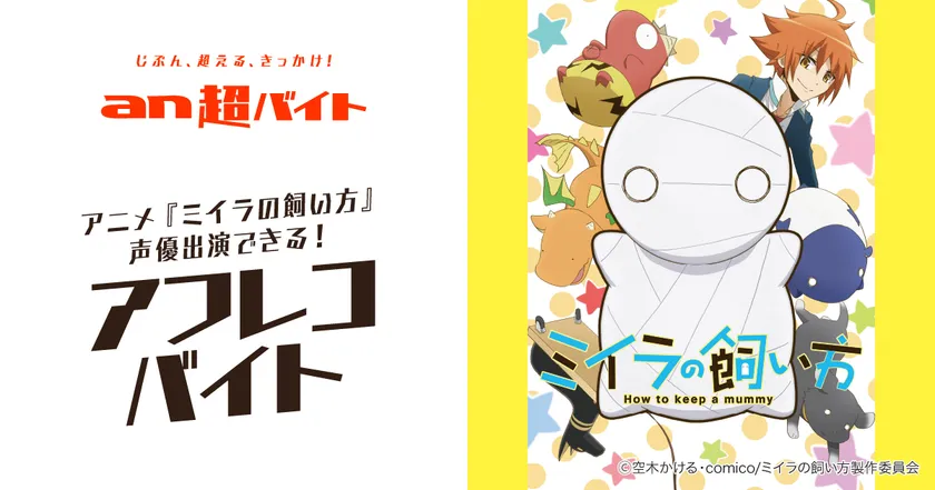 総合人材サービス、パーソルグループのパーソルキャリア株式会社(旧社名:インテリジェンス、本社:東京都千代田区、代表取締役社長:峯尾 太郎)が運営するアルバイト求人情報サービス「an」< https://weban.jp/ >と、NHN comico 株式会社(本社:東京都港区、代表取締役社長:張 鉉洙)が運営する世界累計2,500万ダウンロード突破のマンガ・ノベルサービス「comico(コミコ)」は、思わず挑戦してみたくなるような「an超バイト」の新企画として、「comico」の人気マンガ『ミイラの飼い方』のアニメ化を記念し、モブキャラの声優として出演できるアフレコバイトを2名募集します!報酬は、日給5万円とキャストサイン入り台本をプレゼントします。
