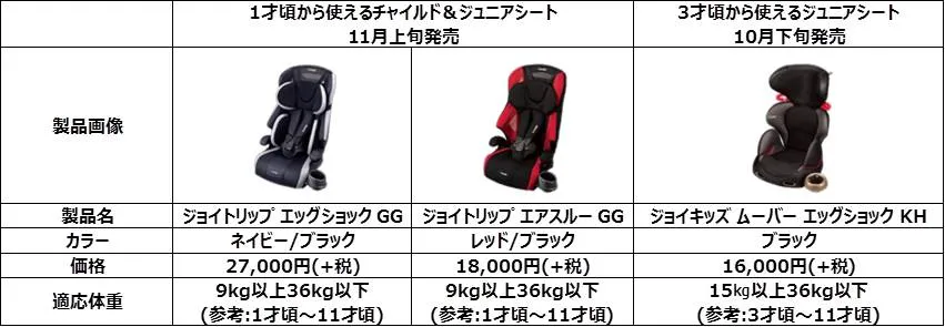 コンビ株式会社は、産まれたての赤ちゃんの頭を守る超・衝撃吸収素材「エッグショック」を搭載した新ジュニアシート「ジョイキッズ ムーバー エッグショック KH」を2017年10月下旬より、「ジョイトリップ エッグショック GG」「ジョイトリップ エアスルー GG」を2017年11月上旬より、全国のベビー用品専門店やGMSなどで販売いたします。