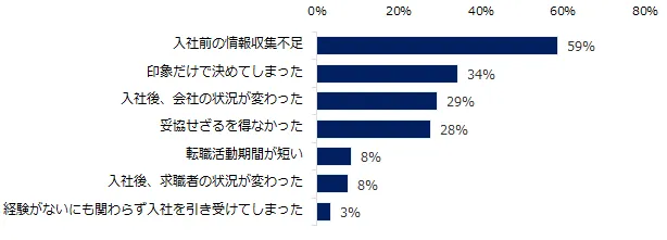 転職後にギャップを感じる原因を質問したところ、「入社前の情報収集不足」(59%)と過半数の方が回答しました。次いで「印象だけで決めてしまった」(34%)、「入社後、会社の状況が変わった」(29%)が挙げられました。ギャップを避けるために転職コンサルタントが行なっているサポート内容を伺うと、もっとも多かった回答は「求人票には載っていない社風などの情報を伝える」(80%)でした。