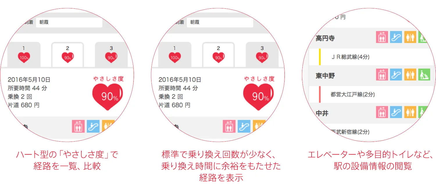 お子さま連れやベビーカーを利用して電車移動をする方にとっての最適経路として、乗り換え回数が少ない・乗り換え時にエレベーターなどが利用できる・多目的トイレがある駅を経由するなどを考慮した「やさしい経路」を優先的に案内し、経路の「やさしさ度」や駅の設備情報を表示することで、お出かけを支援しています。