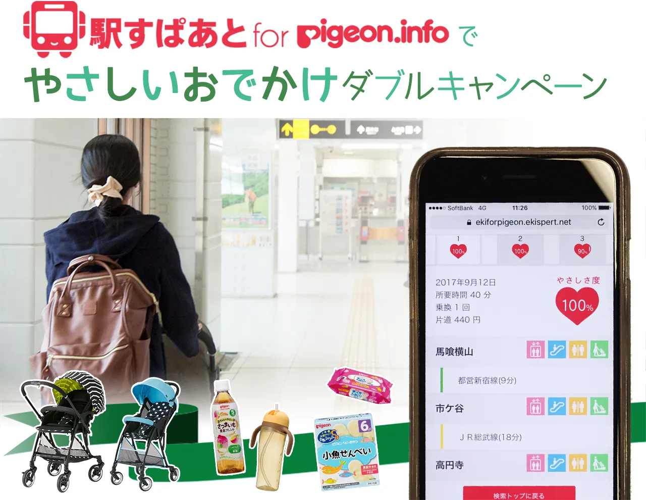 「Pigeon.info」では、「駅すぱあと for Pigeon.info」の第11回キッズデザイン賞・審査委員長特別賞の受賞記念として、お出かけに便利なピジョングッズが当たる「やさしいおでかけダブルキャンペーン」を開催します。