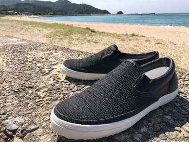 裂き織り生地の特徴を出すために、今回はベーシックな3カラーでスリッポンタイプのデザインにしました。サイズは男性・女性と多くの方に伝統技法を感じていただくために、23cm~27cmで製造しました。