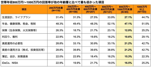 世帯年収1000万円以上の人が、1000万円未満の人よりも金融教育への関心が高いことが分かりましたが、世帯年収に比例して関心が高まるのかというと、そうではないようです。世帯年収が800万〜1000万円では、他のどんな年収層よりも関心が下がる項目が多数ありました。