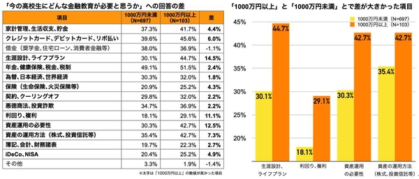 他に差の大きかった項目は「資産運用の必要性」が12.5ポイント、「利回り、複利」が11.1ポイントという結果となりました。世帯年収が1000万円以上の人は、「家計管理、生活収支、貯金」よりも「生涯設計、ライフプラン」「資産運用の必要性」を重視しており、世帯年収1000万円未満の回答者とは明確に傾向が異なりました。