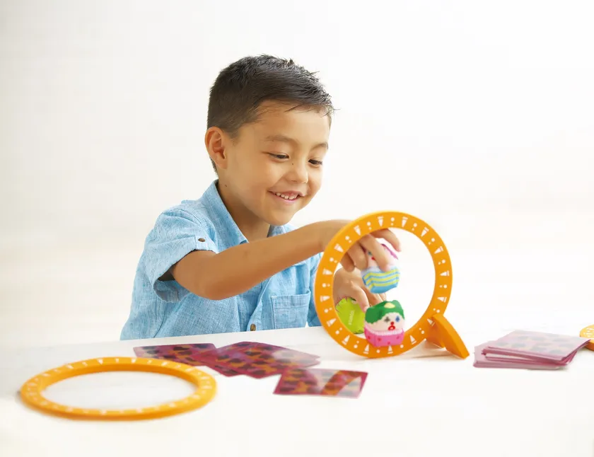 大中小3種類のわっか、スタンドが付属しており、わっかを立てて「まといれあそび」、わっかを投げて「わなげあそび」が楽しめます。わっかにおてだまを乗せたり、転がしたりして楽しむこともできます。レベルに合わせて狙いを変えながら、集中力と手先の感覚を養うことができ、技に挑戦する緊張感や成功した時の達成感を味わうことができます。