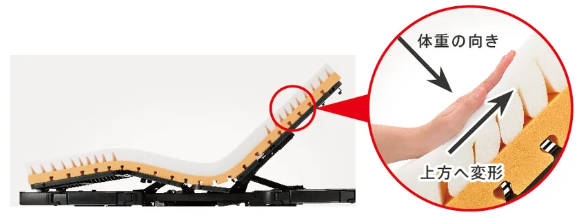 電動ベッドのリクライニングなど多角可変の進化に対応するため、寝心地や機能を損なわない特殊加工を施し追従性をアップしました。