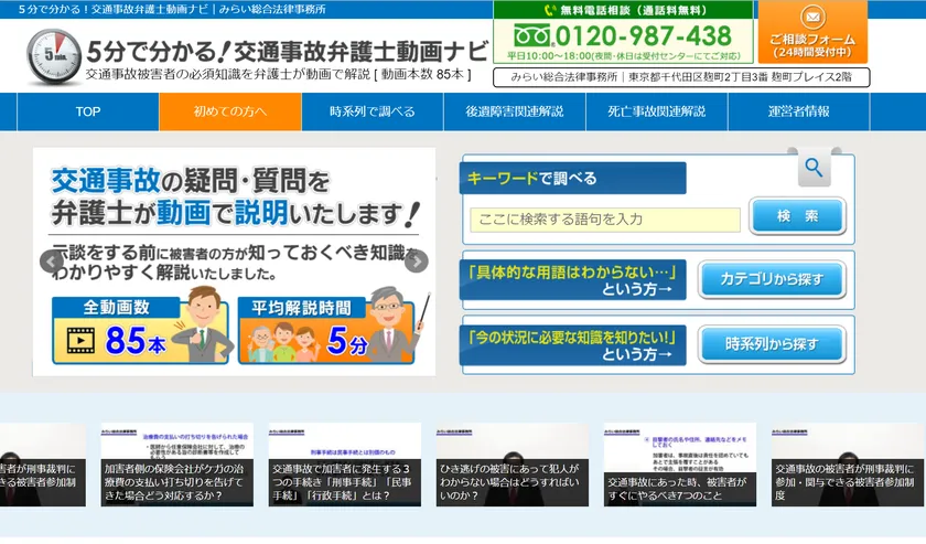 当サイトは、被害者の置かれた状況ごとにカテゴリ分けしており、被害者が知りたい情報にたどり着きやすい動画解説WEBサイトとして構成しています。各テーマの解説時間は5分以内で、理解しやすい内容となっており、交通事故被害で苦しんでいる方々に知っていただきたい情報配信に努めています。