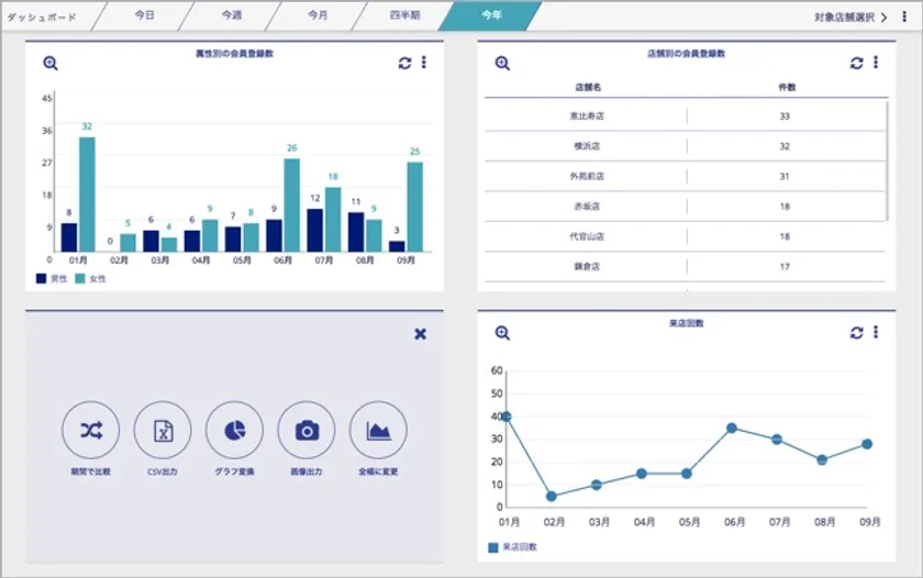 タブの切り替えにより、“今週”“今月”“四半期”“今年”と期間を変えて集計することができ、1つのグラフ上で特定の期間との比較を色分けして表示することもできます。最適なグラフで確認ができるよう“棒グラフ”、“折れ線グラフ”、“円グラフ”、“ドーナツグラフ”、“テーブルグラフ”表示を任意で切り替えたり、配置変更にも対応しています。集計データをCSVファイルでダウンロードする機能もあり、データを用いた資料作成などに役立ちます。
