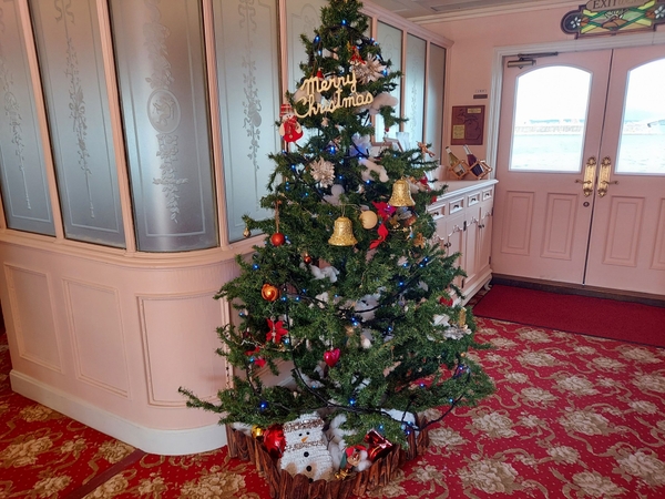 船内をクリスマスツリーやモチーフで華やかに装飾します。