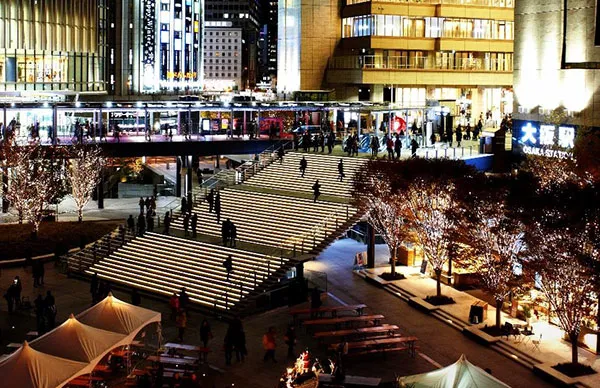 昨年に引き続き、恒例のJR大阪駅前に広がる約1haにおよぶ「うめきた広場」の周辺、けやき並木」の樹木約95本がシャンパンゴールド色のLED約30万球で上品に光り輝きます。