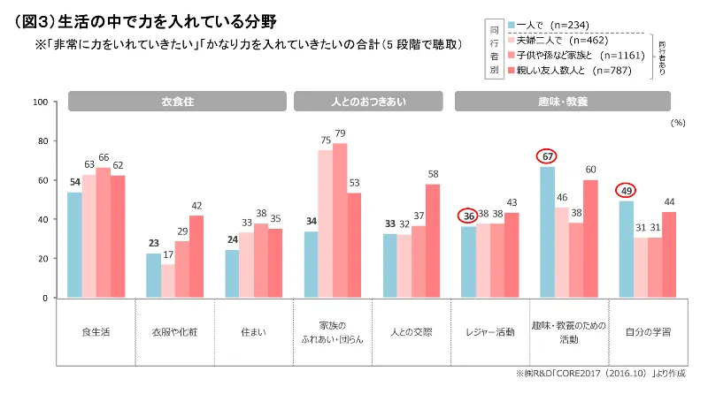 ・『一人で』旅行する人は、同行者ありに比べて、【衣食住】【人とのおつきあい】の分野には力を入れていない傾向。