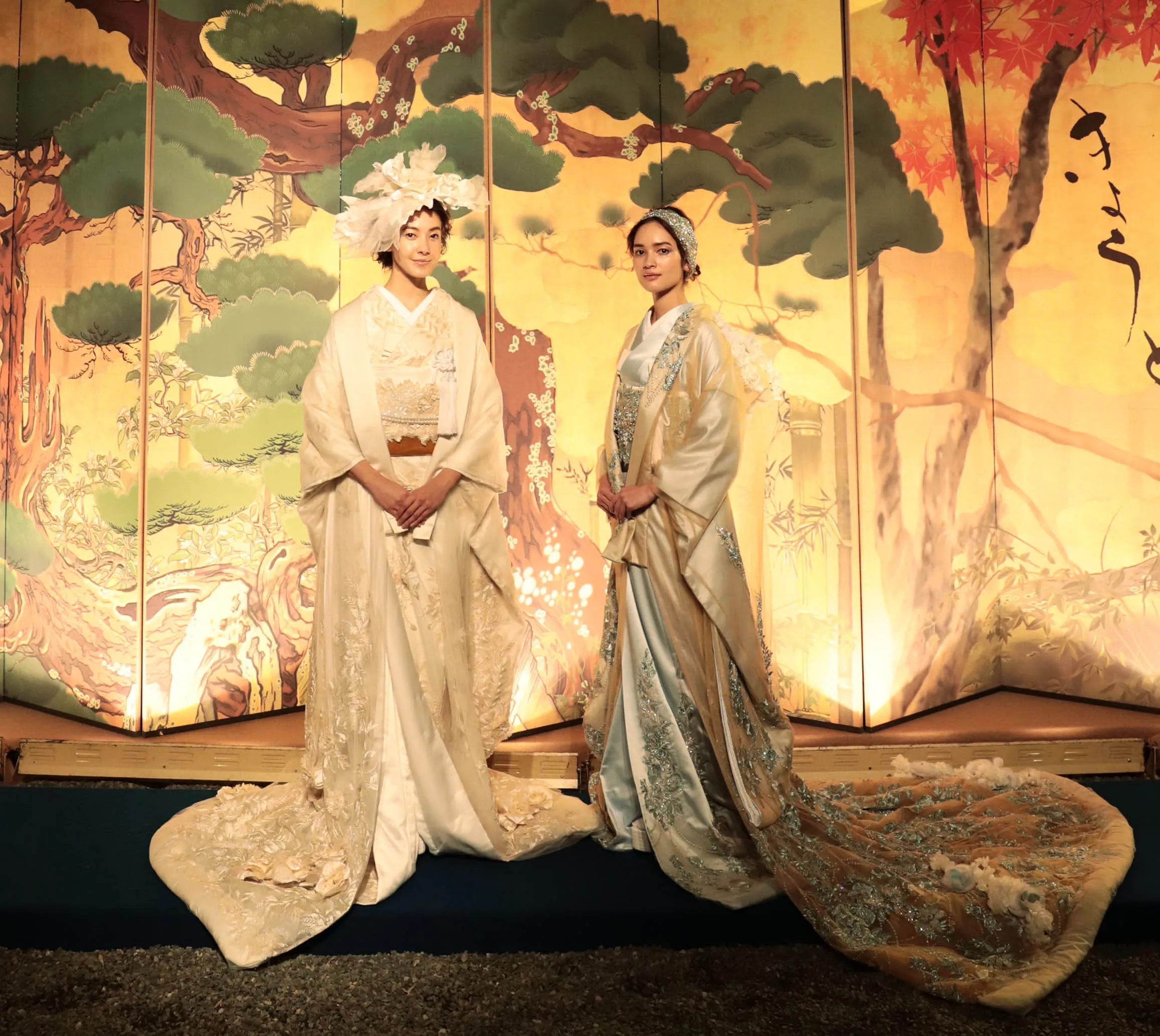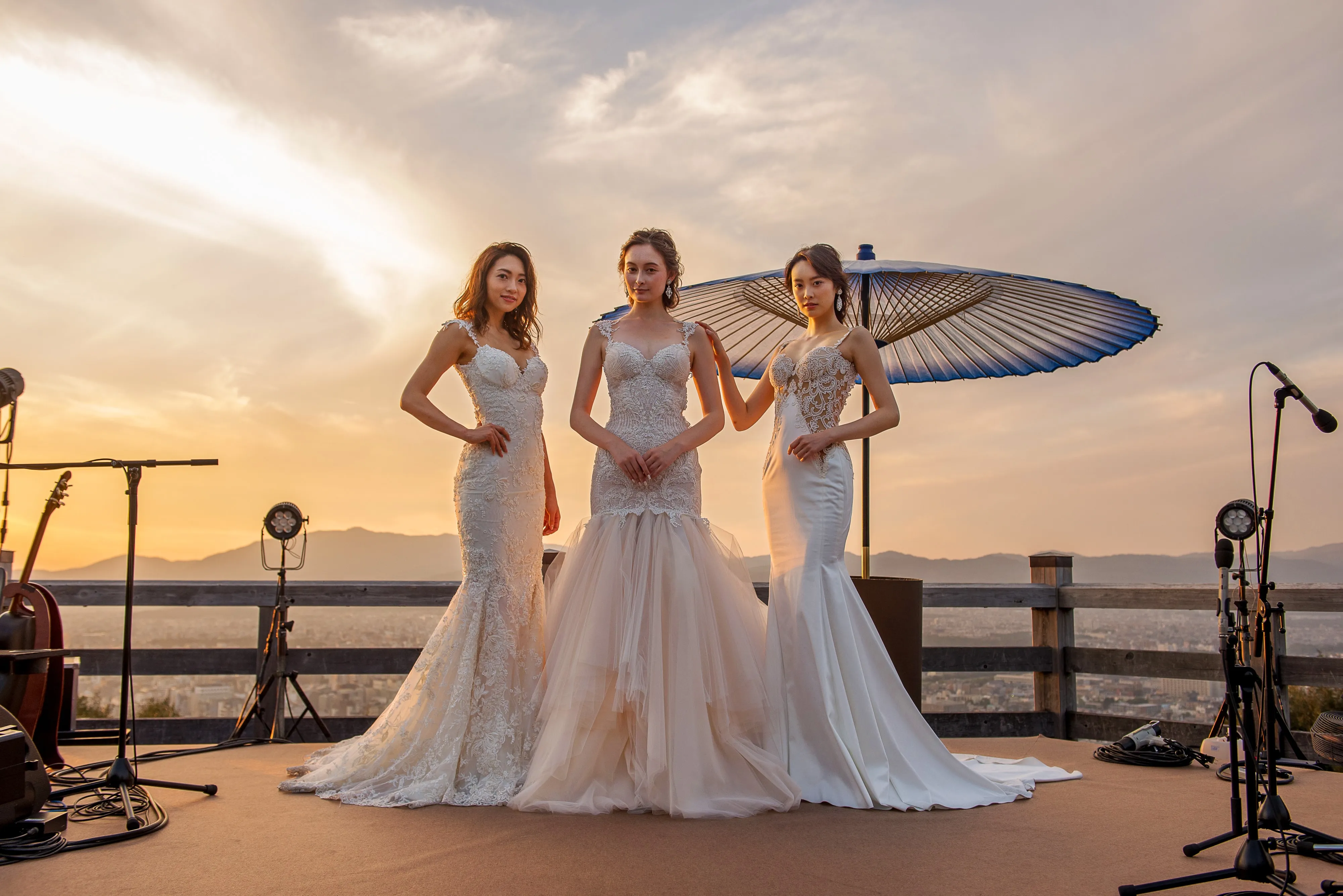 受付では長さ13メートルもの巨大な屏風が皆様をお出迎え。大護摩堂でのカクテルパーティーからスタートし、京都の街を一望できる大舞台に場所を移して、ジャズダンスカンパニー・Memorable Momentの壮大なダンスパフォーマンスをご覧いただきました。会場が幻想的な空気に包まれる中、続いてシンガー・Olivia Burrellによる祈りを込めた聲明(しょうみょう)や、越智ブラザーズのパーカッションを披露。文化と伝統を誇る京都にて、「きょうといちえ」だからこそ実現した圧巻のパフォーマンスをご堪能いただいた後には、ギター・デュオのゴンチチとモデルによる2夜限りのスペシャルコラボレーションも実現。日本の伝統美と革新的感性が融合した打掛と、格別な美しさで世界中の花嫁を魅力するGalia Lahav(ガリア・ラハヴ)のウエディングドレスが、京都の夜空の下、ギターの音色に包まれながら雅やかで華々しいステージを飾りました。