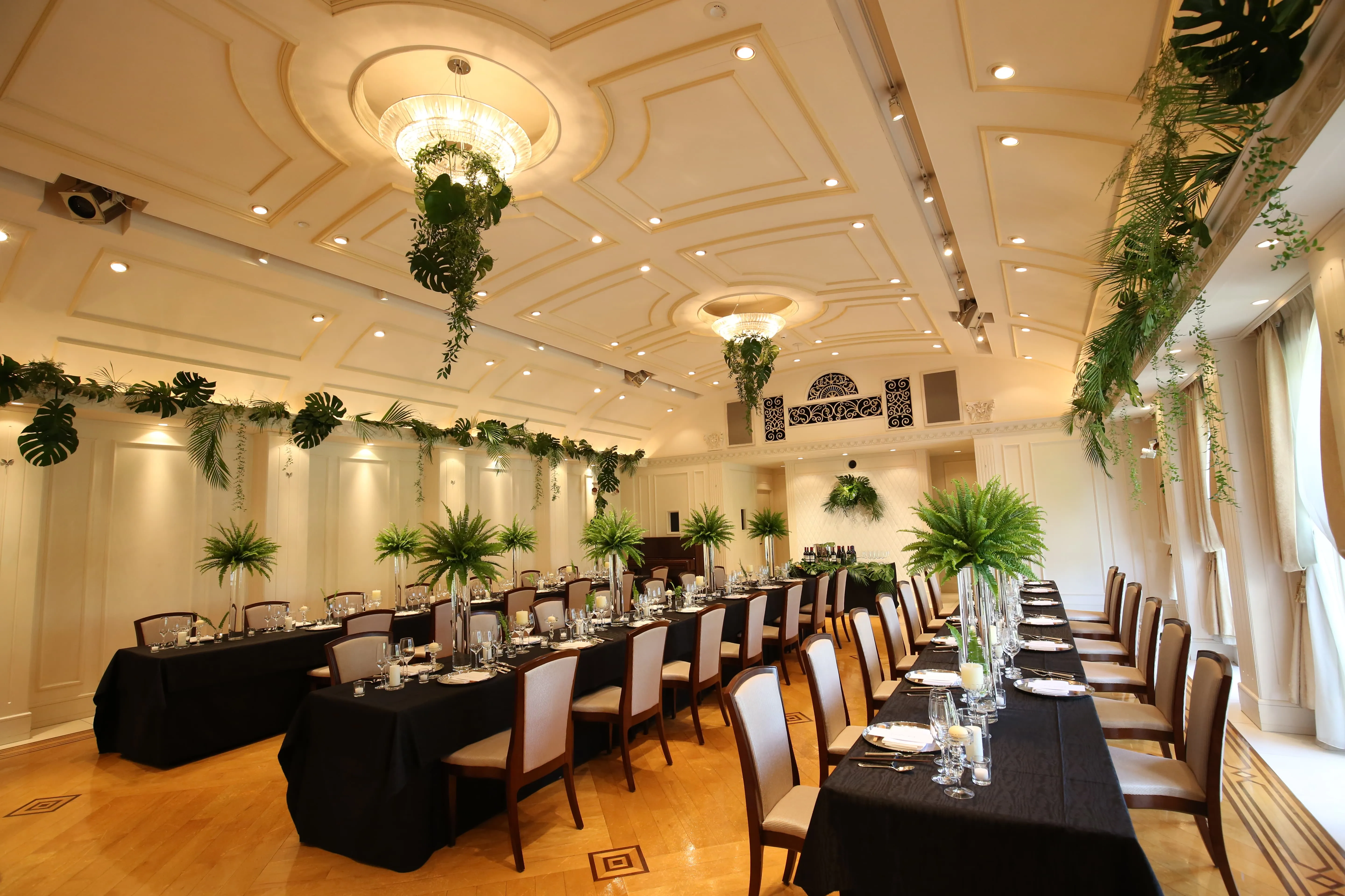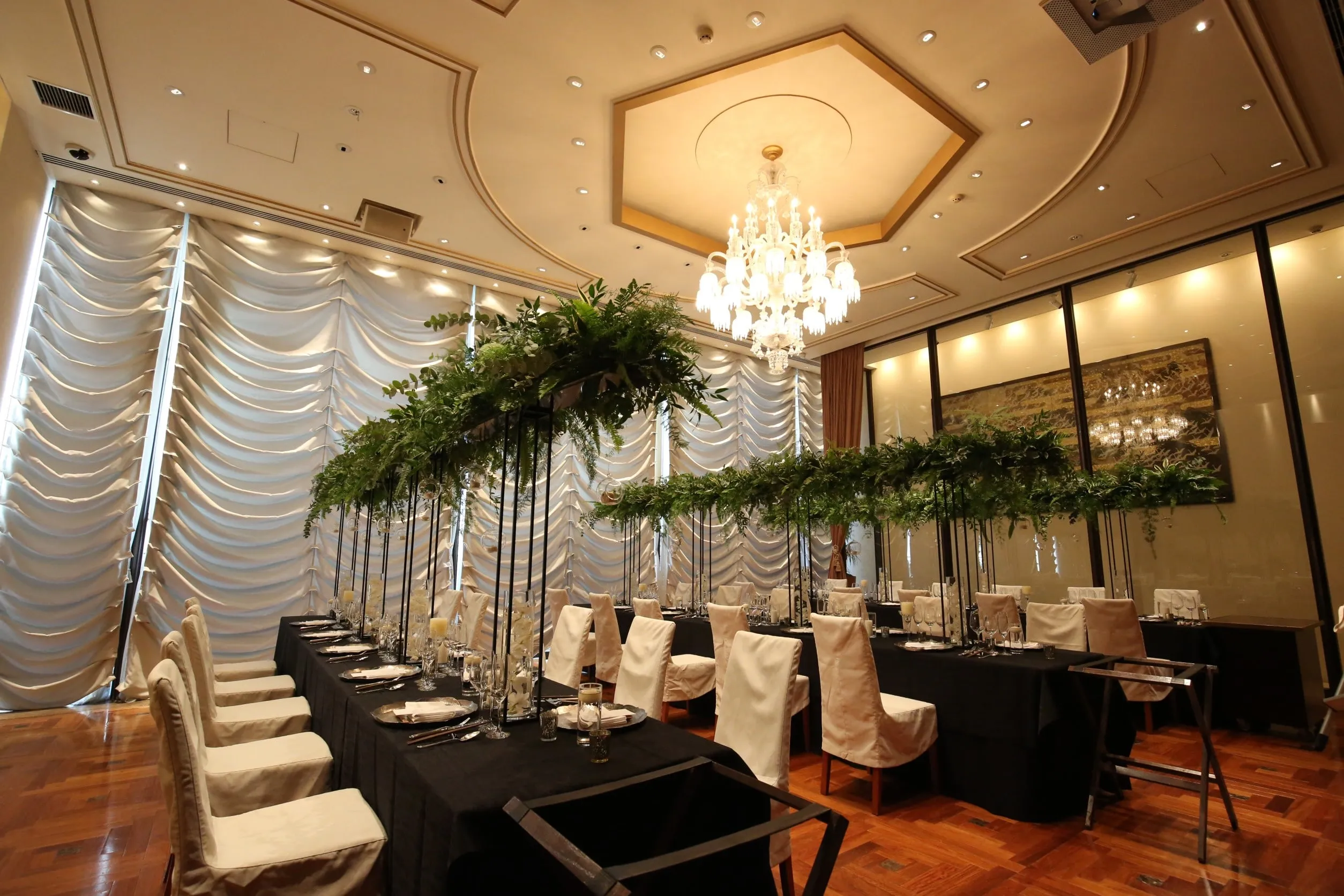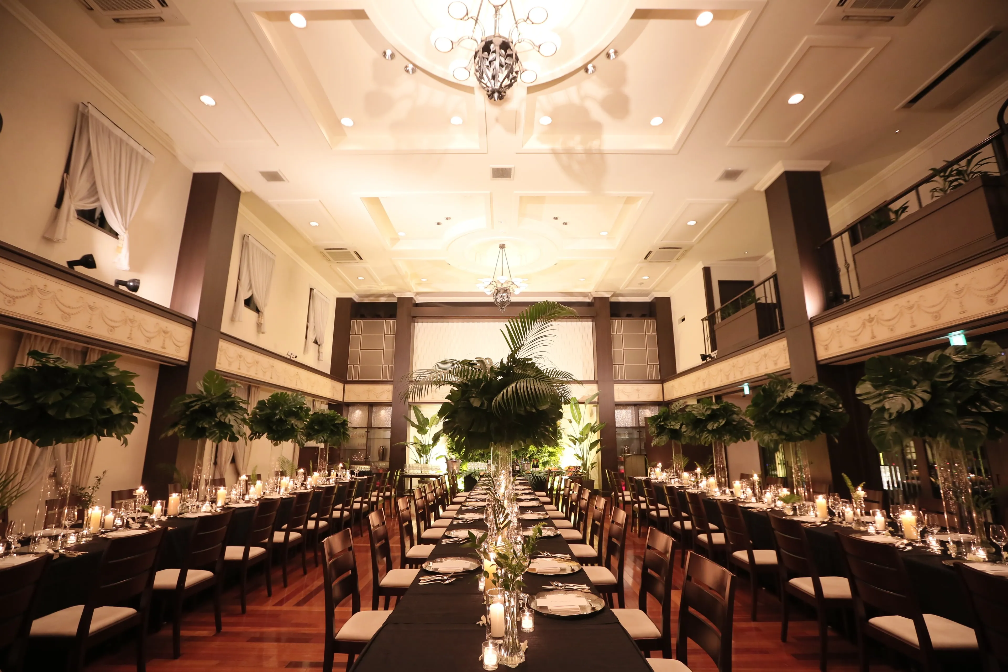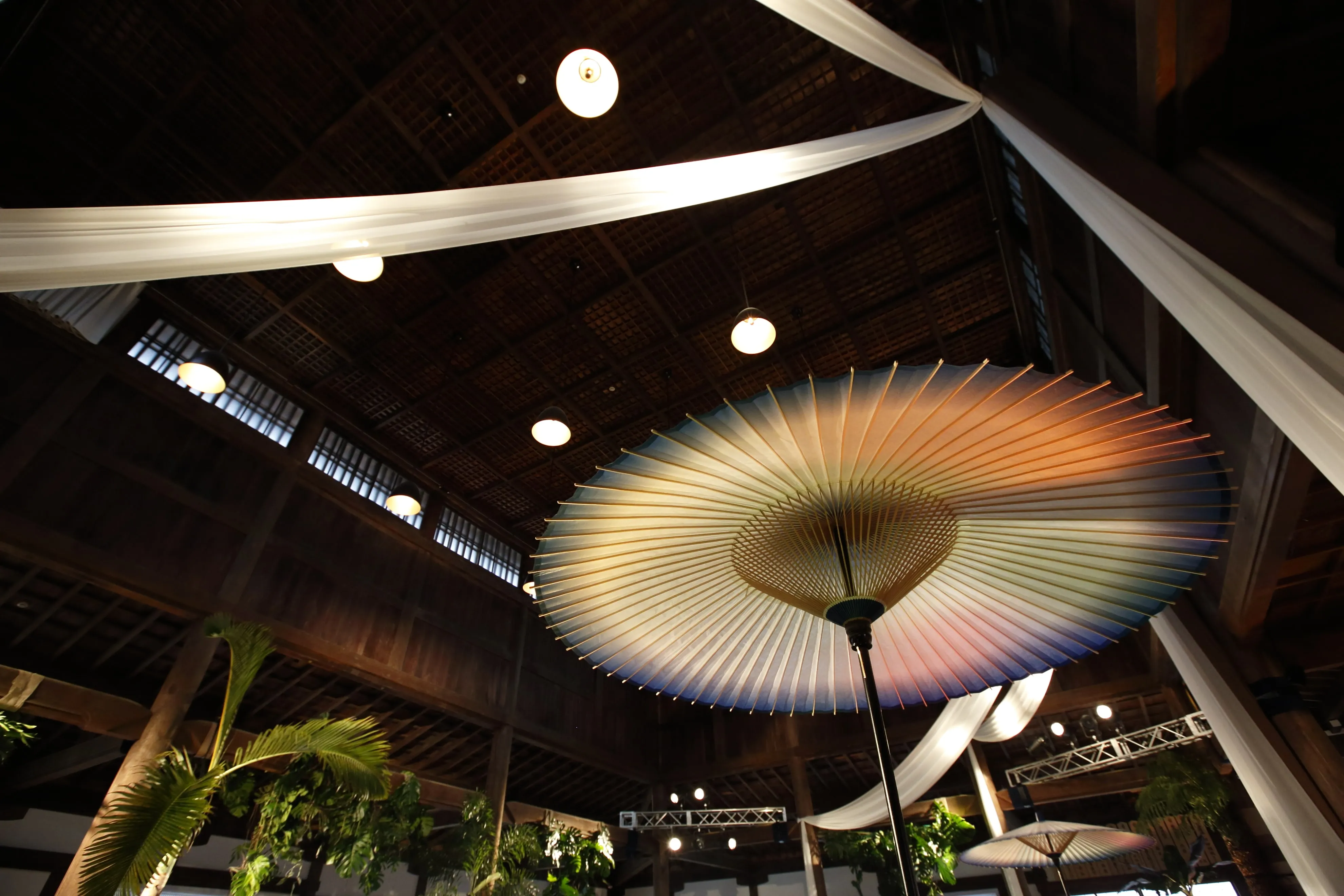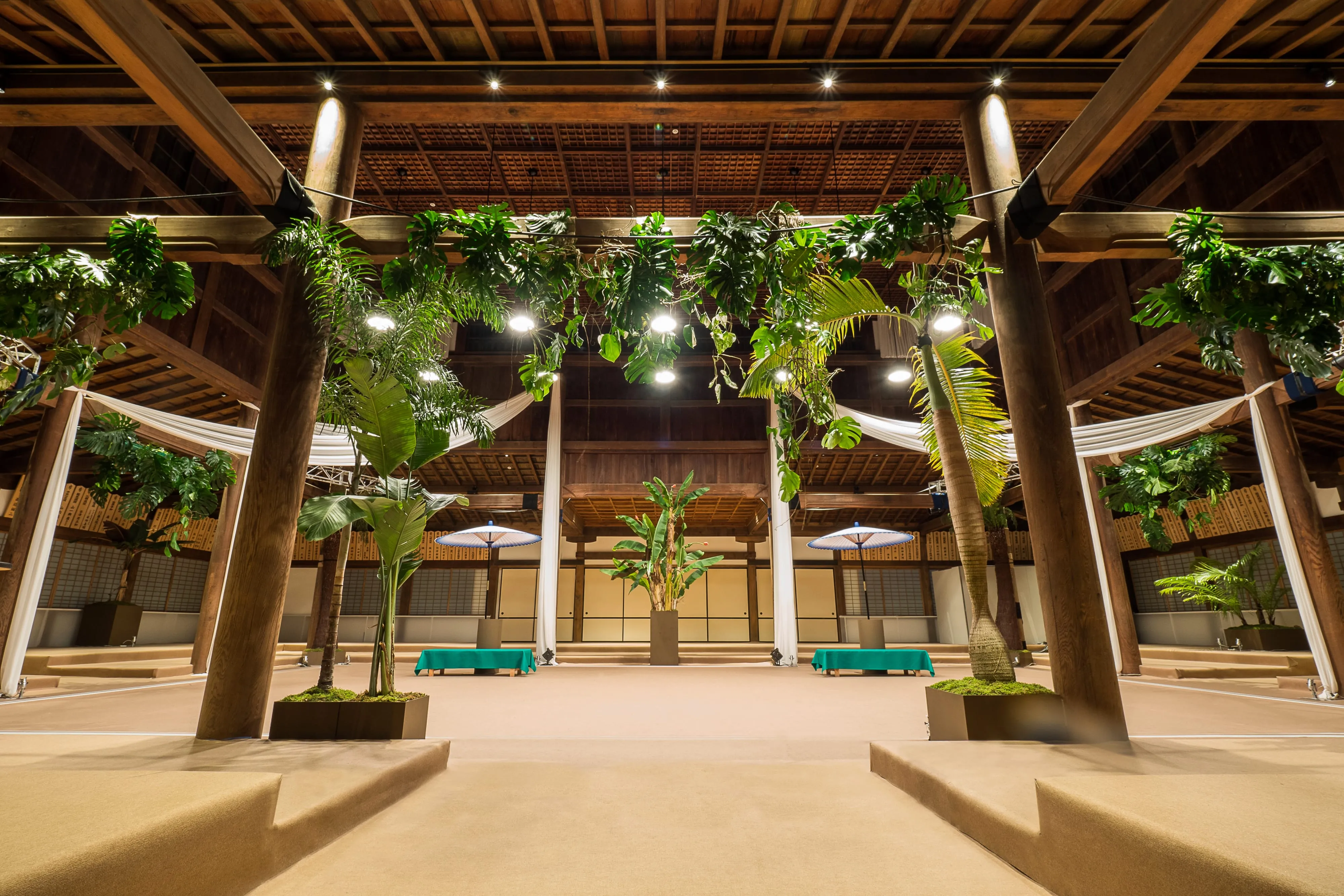大護摩堂内で香りの演出と共に芸妓・舞妓がお客様をお出迎え。TAKAMI BRIDALのパーティコーディネートを手掛けるMotif Event Designの、専属フラワーチームであるLILY ROSEが「Pacific Rim」をテーマに特別な空間を演出いたしました。