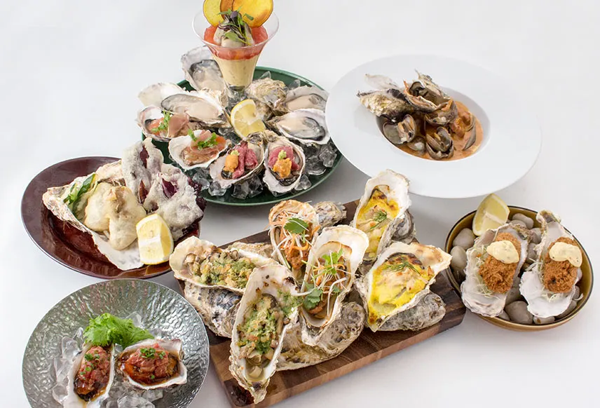 上記、「ウニとローストビーフのオイスターカクテル」「あぶり牡蠣と馬肉のオイスターカクテルのほかに、ホットオイスタープレートでは、「マスタードチキンの焼き牡蠣」や「ジンジャーポークの焼き牡蠣」などが牡蠣13ピースが入ったお肉料理と牡蠣を存分にお楽しみいただけるセットです。
