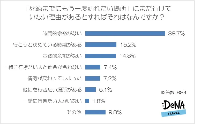 一番多く挙げられていた理由は「時間的余裕がない」(38.7%)、2番目に多かったのが「行こうと決めている時期がある」(15.2%)となりました。