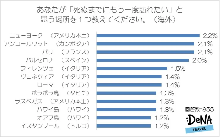 場所別で見ても1位はアメリカ本土の「ニューヨーク」(2.2%)となりました。次点では国別では上位にランクインしなかったカンボジアの「アンコールワット」(2.1%)が2位に入る結果となりました。カンボジアを選んだ人のほとんどがアンコールワットを選んでいました。同率の2位はフランス「パリ」(2.1%)でした。イタリアは「フィレンツェ」(1.5%)「ヴェネツィア」「ローマ」(ともに1.4%)と3都市に均等に票が入りました。ビーチリゾートとしては人気のハワイと並び、“地上で最も美しい島”とも言われるタヒチの「ボラボラ島」(1.3%)が上位に入りました。