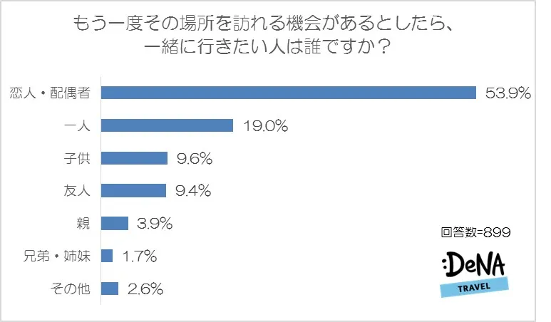 「恋人・配偶者」が53.9%と圧倒的多数を占める結果となりました。次に多かったのが「一人」(19.0%)と、誰かと一緒に行くのではなく一人旅を希望している人も一定数いることがわかります。