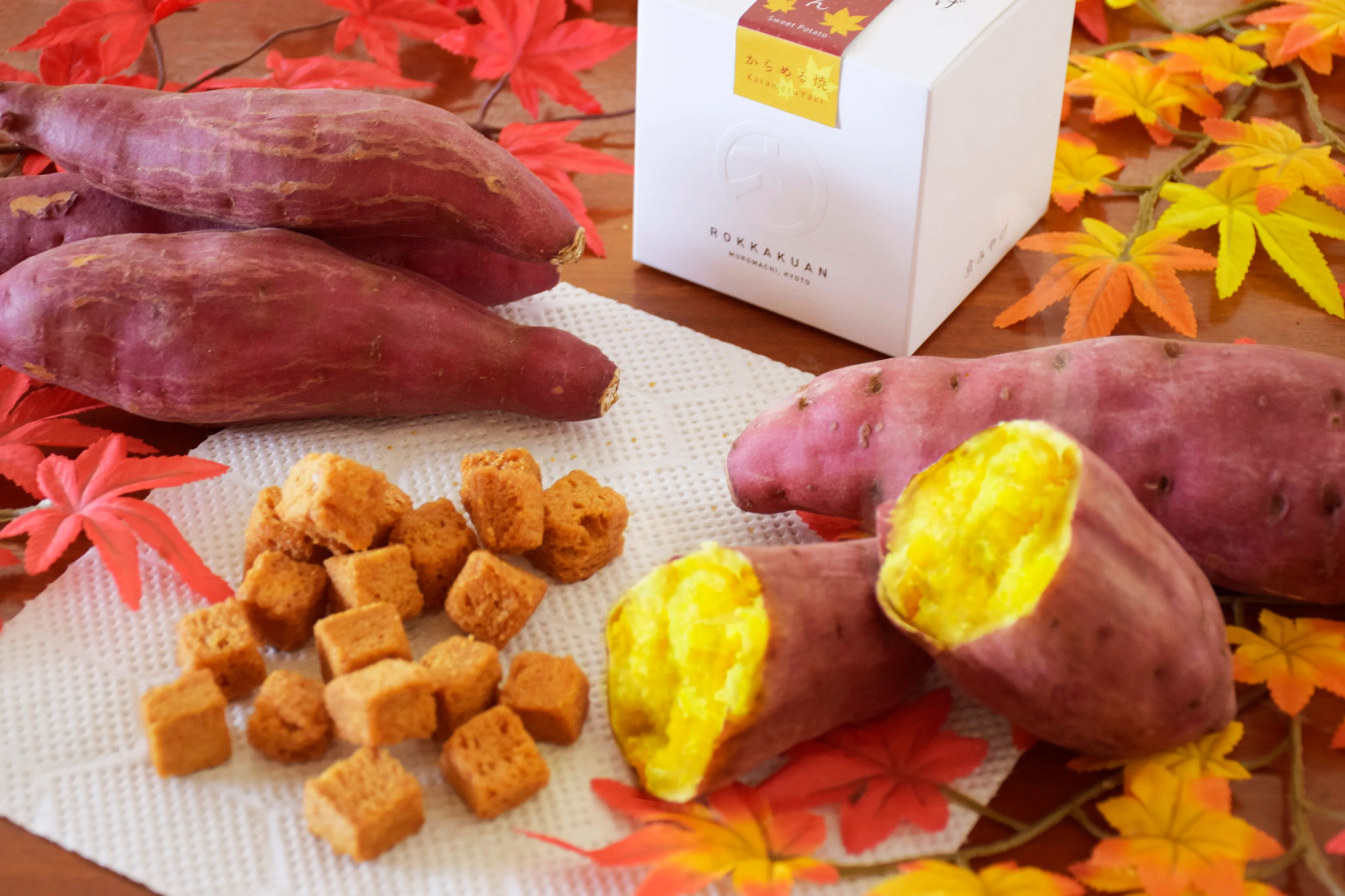 からめる焼「おいもはん」は、さつまいもを楽しんでいただくために素材を贅沢に使用し、お口の中にお芋の甘みが広がる風味に仕上げました。からめる焼の独特の食感とやさしい口溶けで、お子様からお年寄りまで親しみやすいお味となっています。また、ネーミングでは、京都らしさ溢れる上方言葉を利用し、多くの人に愛されるようにと、芋に京都らしい人称を取り入れました。限定パッケージは、お芋と紅葉のイラストの入ったポップな帯デザイン。お土産にもご自宅用にもぴったりの秋らしいオリジナルスイーツです。