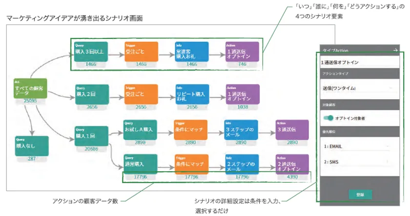 メール開封率やクリック、購買成果などがリアルタイムに把握でき、そのアクション結果からさらに、セグメント分類、タグ付けするなど、直接次のシナリオへ反映、実行することができます。施策のフィードバックを繰り返すことで生み出される無限のシナリオは、One to Oneのアナログアクションをデジタル環境下で実現できます。