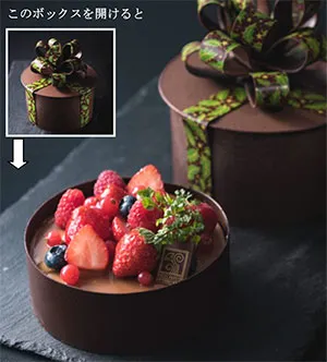 (2)ボックスを開けると、中にはストロベリーやブルーベリー、フランボワーズ、グロゼイユを飾った華やかなケーキが。