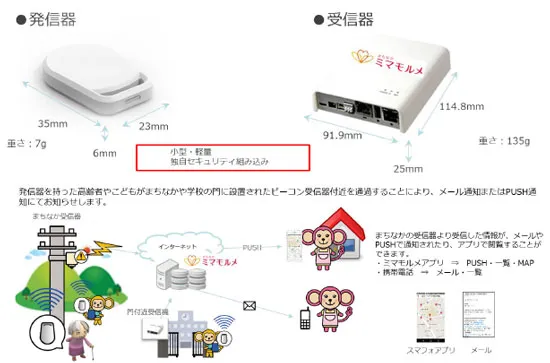 (2)ハンズフリーの無線ICタグを用いることによって、子どもに負荷をかけません。また、ランドセルに入れるタイプのタグを用いますので、誰がサービスを受けているかは分かりません(サービスを受けられる方の匿名性が保てます。)。また、無線ICタグを持った子どもが、ミマモルメの設備が設置された他の小学校、他の施設に行ってもメールが送信されます。
