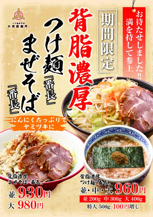 三田製麺所、秋の新商品 “背脂”と“ニンニク”たっぷりのワルな見た目に、 オリーブオイルのやさしさを兼ね備えた 「番長」シリーズ登場!!