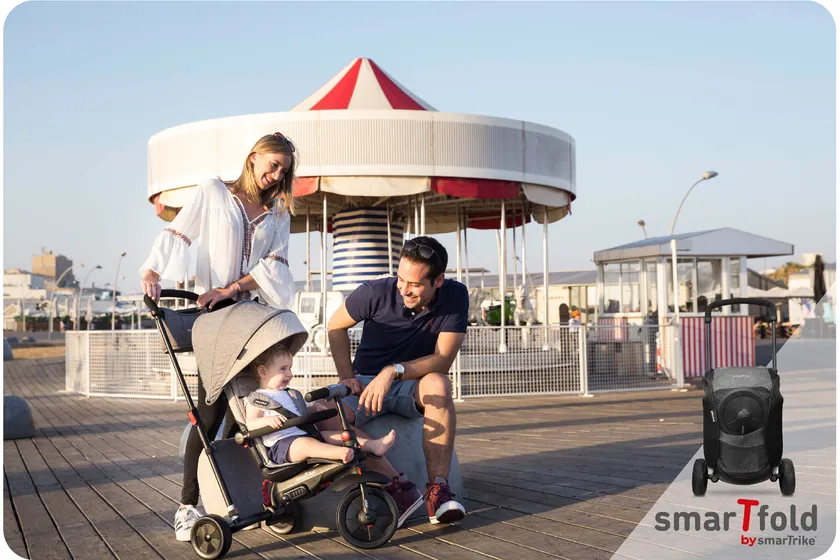 最新型のSmarTfold(TM)はこれまでにない画期的なベビーカー型三輪車として、お出かけ・移動・保管に関するニーズを網羅します。