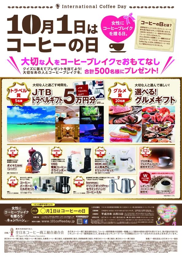 今回は、JTBトラベルギフトや、グルメカタログギフトの他、賛助会員協賛によるコーヒー関連賞品、さらに組合各社が厳選したコーヒーをラインナップ。Wチャンスで400名にレギュラーコーヒー詰合せが当たります。
