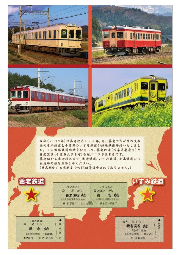 これは、いすみ鉄道の本社がある千葉県大多喜町が名所「養老渓谷」を有し、養老鉄道が沿線に「養老の滝」を有することから、「養老つながり」として提携するもので、2017年が日本の元号が「養老」に改元されて1300年目を迎える年であることにちなみ、両鉄道が地域住民の大切な移動手段として存続していくとともに、貴重な地域資源として愛され利用してもらうための各種活性化策等に連携して取り組んでいくことを目的としています。